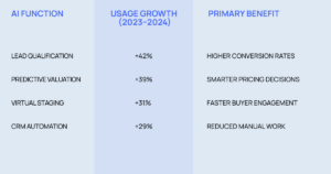 AI adoption isn’t just accelerating — it’s becoming the industry standard. A 2024 Delta Media survey found that 75% of top U.S. brokerages now use AI for tasks like workflow automation, client behavior prediction, and price analysis.