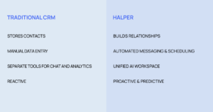 Unlike typical CRMs, Halper isn’t just a data tool — it’s an AI business manager designed for real estate professionals. It connects communication, scheduling, and analytics into one intelligent workspace.